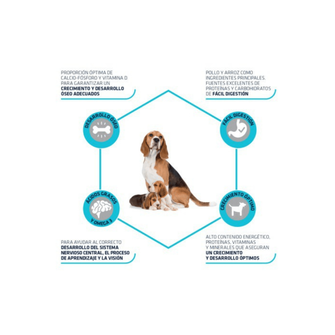 - La exclusiva formulación con nucleótidos permite la mejora de la eficiencia en la replicación de las células, por otro lado, también facilita el desarrollo máximo de los distintos tejidos del cachorro.
