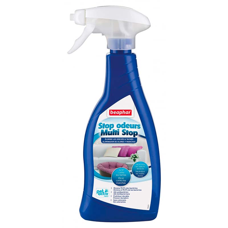 Beaphar Multi Stop Eliminador de Olores y Manchas ha sido desarrollado para eliminar los malos olores en el ambiente de las mascotas y las manchas, gracias a su triple acción: