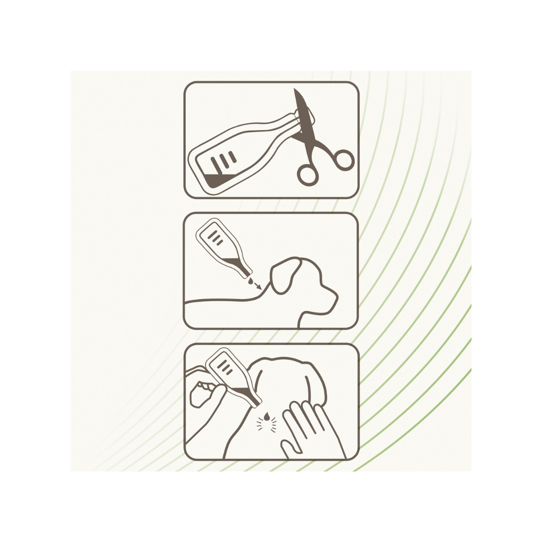 Abrir la pipeta rompiendo el extremo y aplicar el contenido en el cuello del perro, detrás de las orejas, para que no pueda lamer el producto. En los perros blancos, el producto puede provocar una decoloración temporal del pelaje en el punto de depósito. Las pipetas tardan unos días en funcionar correctamente. Como este producto contiene extractos de plantas, es posible que algunas garrapatas permanezcan en los animales. Por ello, no se puede excluir la transmisión de enfermedades infecciosas (Piroplasmosis…).