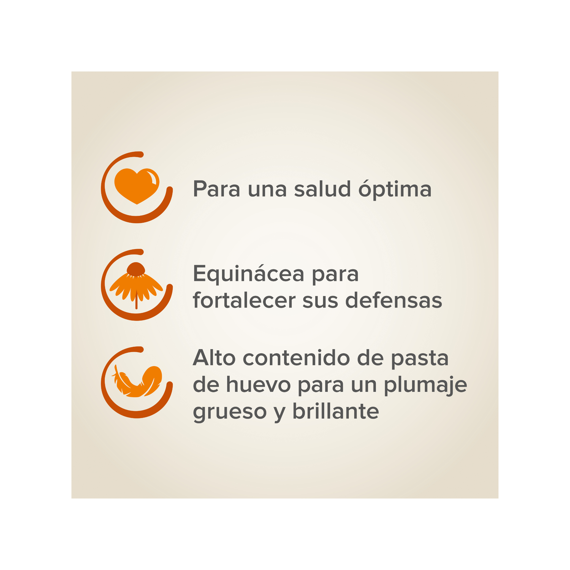 ALIMENTO COMPLETO, SABROSO Y EQUILIBRADO Contiene una mezcla de semillas de alta calidad, pasta de huevo y frutas, incluyendo plátano y papaya.