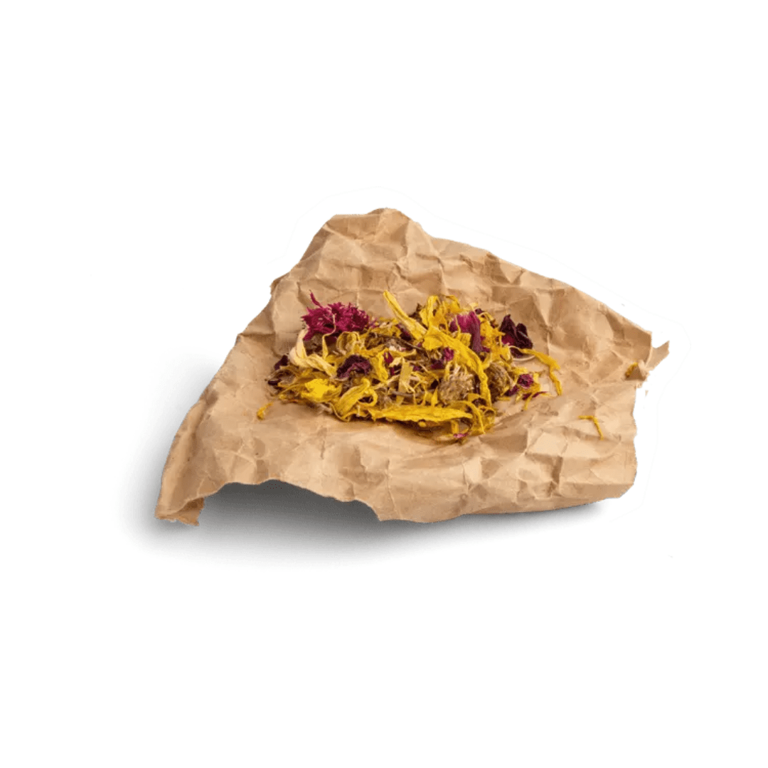 - Pétalos de caléndula, flores de trébol rojo (30%), pétalos de rosa, flores de aciano rojas, margarita (3%)