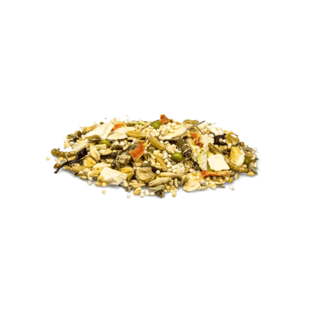 Mijo plata, alpiste, copos de guisantes, copos de espelta, semillas de quinoa (6%), kamut®, judías mungo (5%), mijo común, avena, mijo rojo, dari, alfalfa, hojas de diente de león (3%), amaranto inflado (2,5%), zanahorias, pastinaca, raízes de achicoria, sésamo, blanten menor (1%), granos de avena, carbonato cálcico, remolacha, gusanos de la harina (1%), flores de manzanilla, grillo (0,2%), harina forrajera de trigo