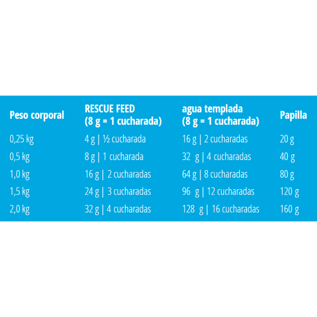 Mezclar RESCUE FEED con agua templada hasta obtener una papilla. Introducir directamente en una jeringa de alimentación o administrar como papilla o bolas de papilla en un cuenco pequeño. Repartir la ración diaria en 3-5 porciones preparadas al momento. Almacenar las sobras en un lugar fresco y consumir lo antes posible.