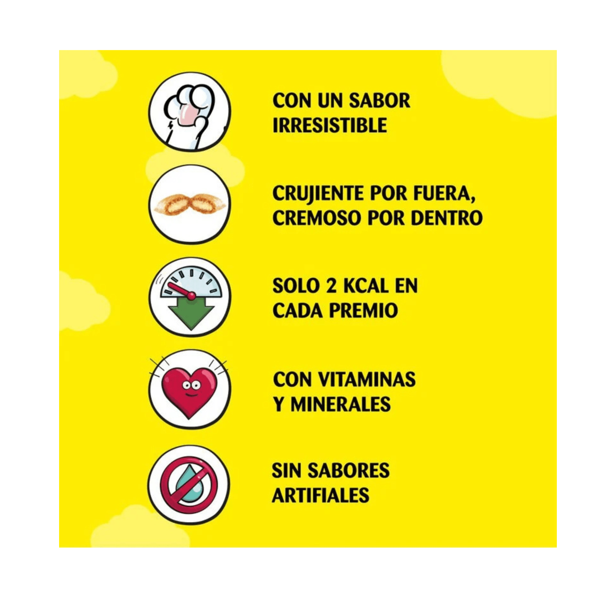 - Snack para gatos sabor queso con textura crujiente por fuera y cremosa por dentro.