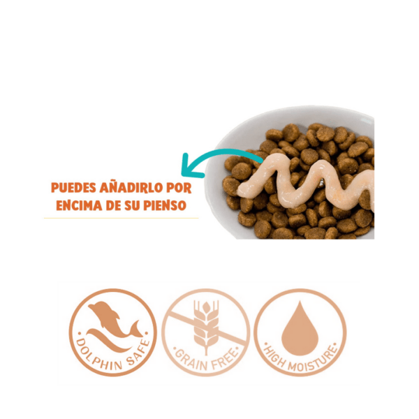 - Receta Atún y Salmón: (10 sobres de 14g) Atún, tapioca, salmón, saborizantes naturales, saborizante natural de atún, goma guar, colágeno, suplemento de vitamina E, extracto de té verde.