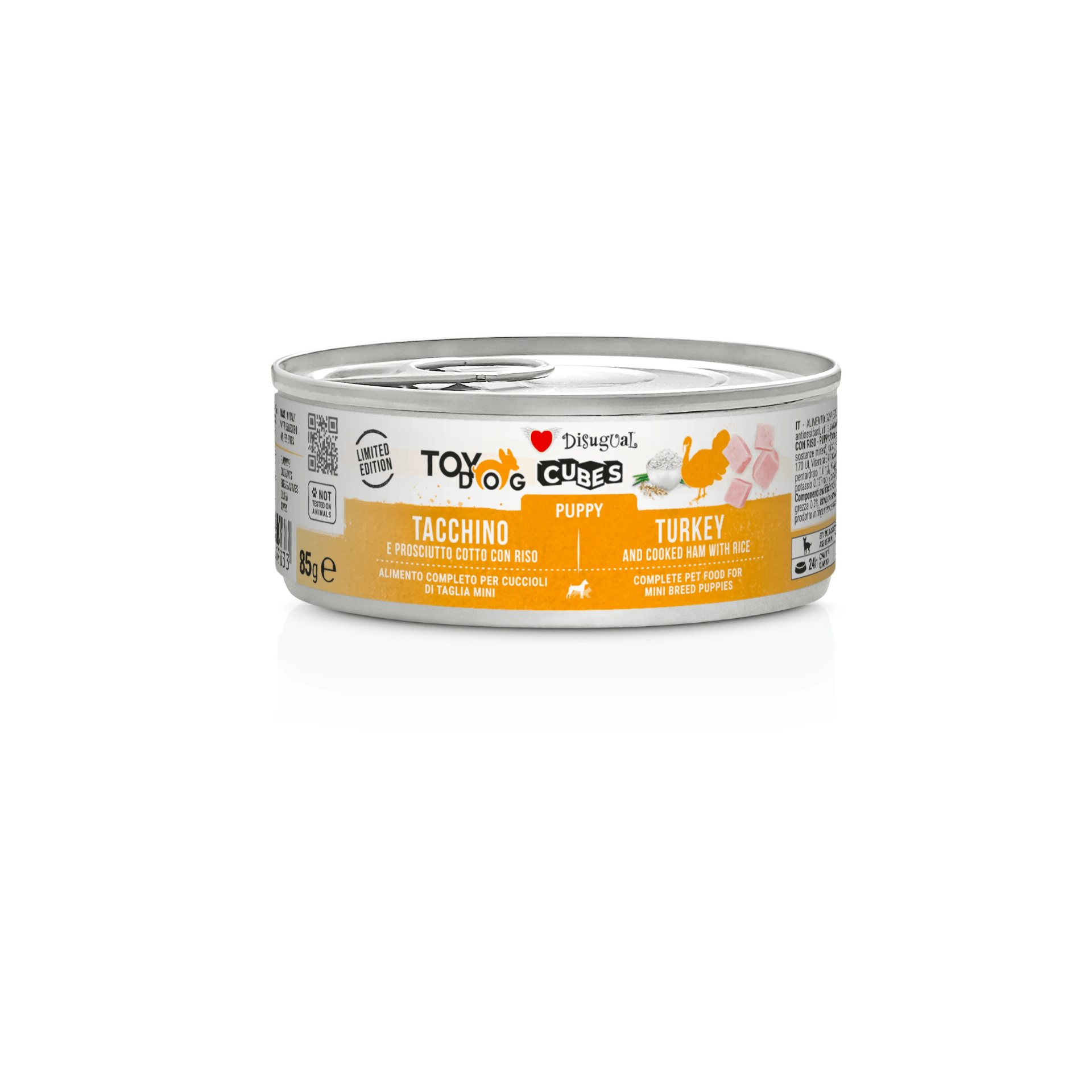 Disugual Cubes Cachorro Pavo y Jamón es un alimento húmedo completo especialmente formulado para perritos en proceso de crecimiento. El pack de 12 tarrinas de 85 g ofrece una combinación deliciosa de carne de pavo y trozos de jamón, con una textura mixta de cubitos y carne picada pensada para seducir el apetito de los cachorros.