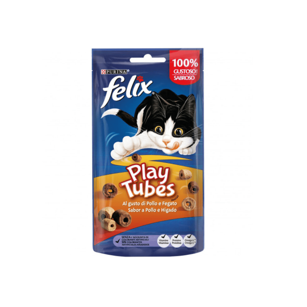 Los snacks Felix Party Tubes están elaborados con ingredientes de calidad y tienen un exquisito sabor a pollo e hígado. Contienen proteínas, vitaminas y ácidos grasos omega 6 que enriquecen la dieta habitual de tu gato. Además, no contienen colorantes artificiales añadidos.