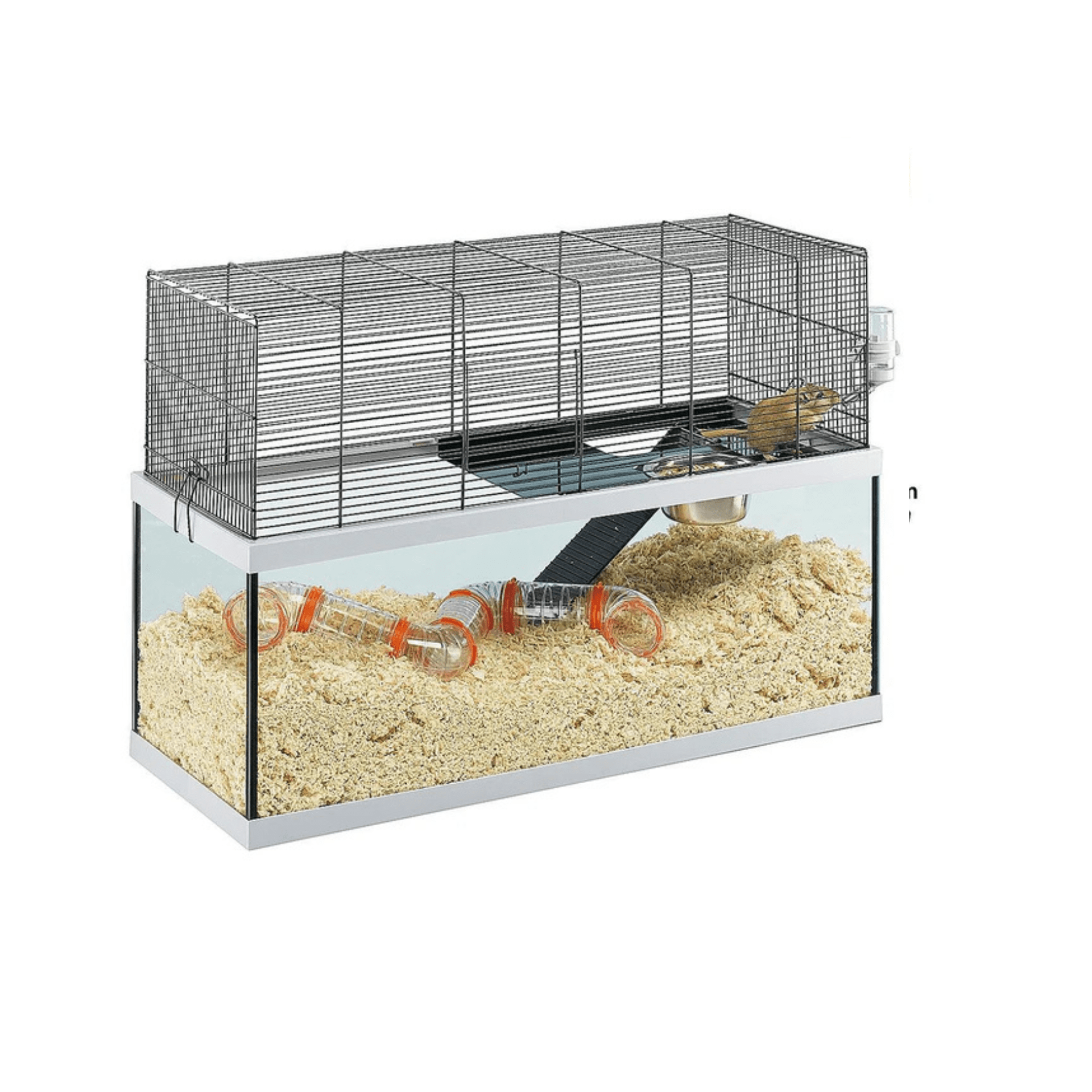 - Gabry es una jaula de jerbo de vidrio con una estructura de malla de alambre y puertas que se abren desde el exterior.