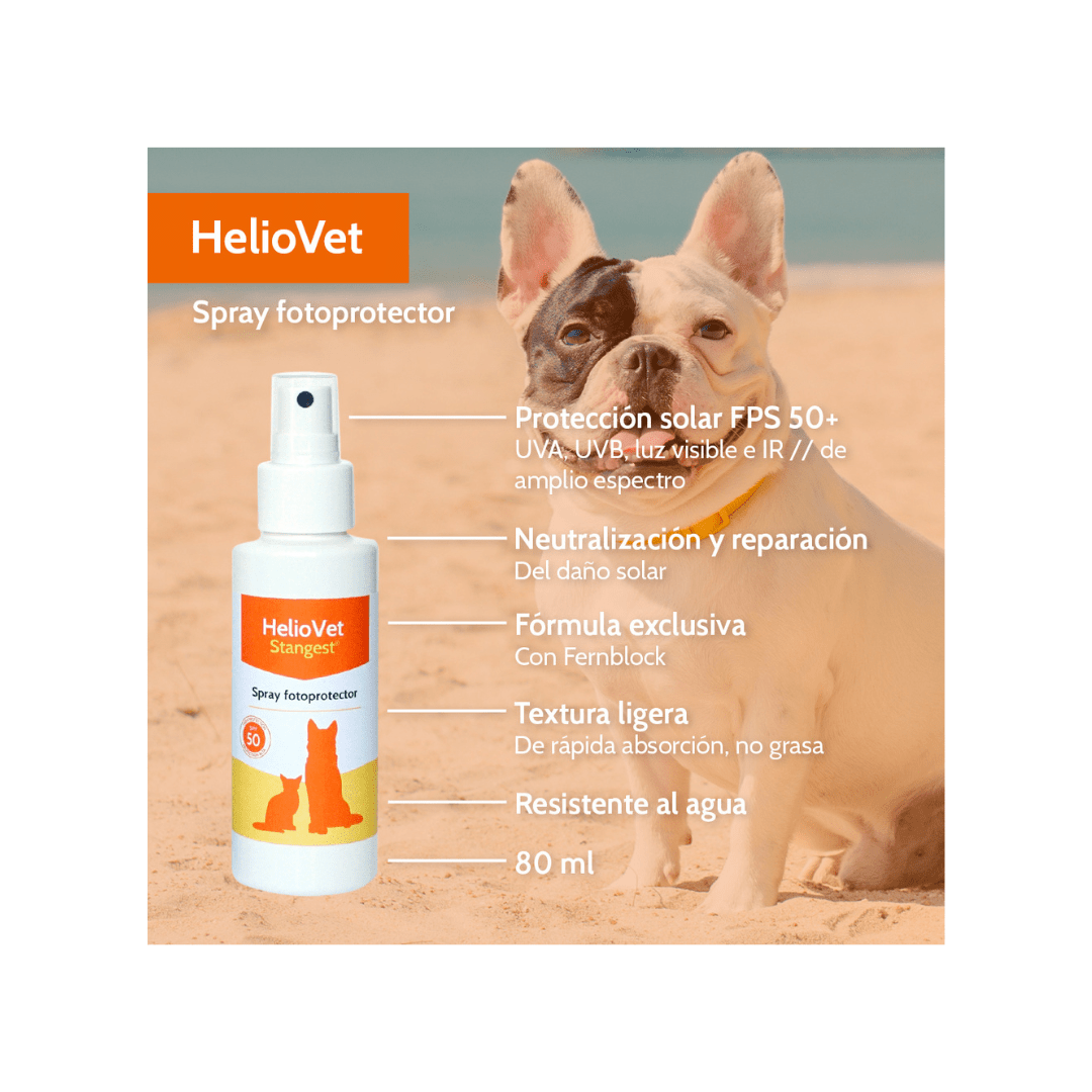 El protector solar HelioVet de Stangest ofrece una protección muy alta (SPF50+) frente a los efectos nocivos del sol, incluyendo los rayos UVA y UVB, infrarrojos y luz visible.