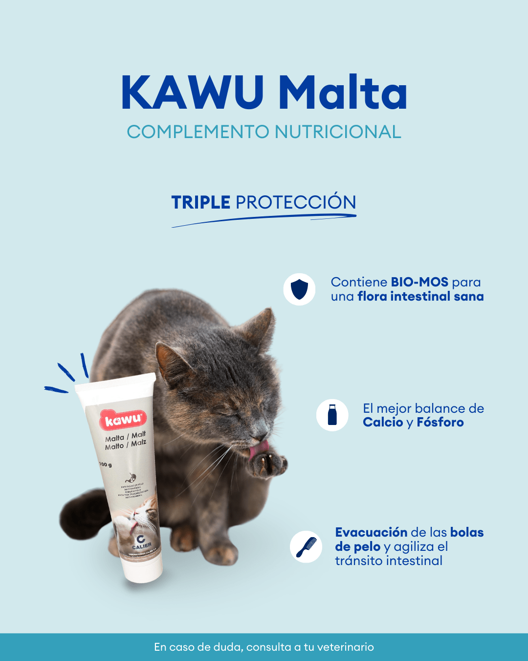 Kawu Malta para gatos es un complemento nutricional en formato pasta que favorece la digestión y ayuda a eliminar las bolas de pelo que se forman en el aparato digestivo de los felinos, especialmente durante la muda. Gracias a su sabor apetecible y su fórmula eficaz, se convierte en una rutina fácil y saludable para tu gato.