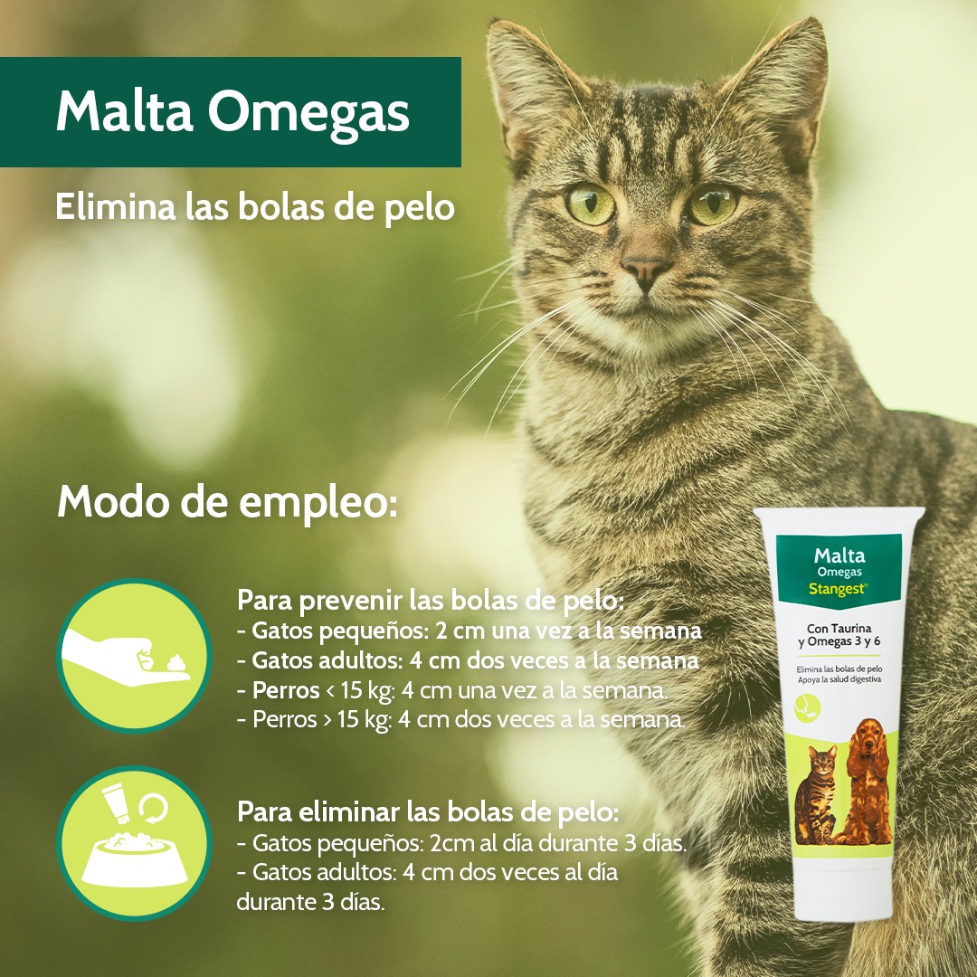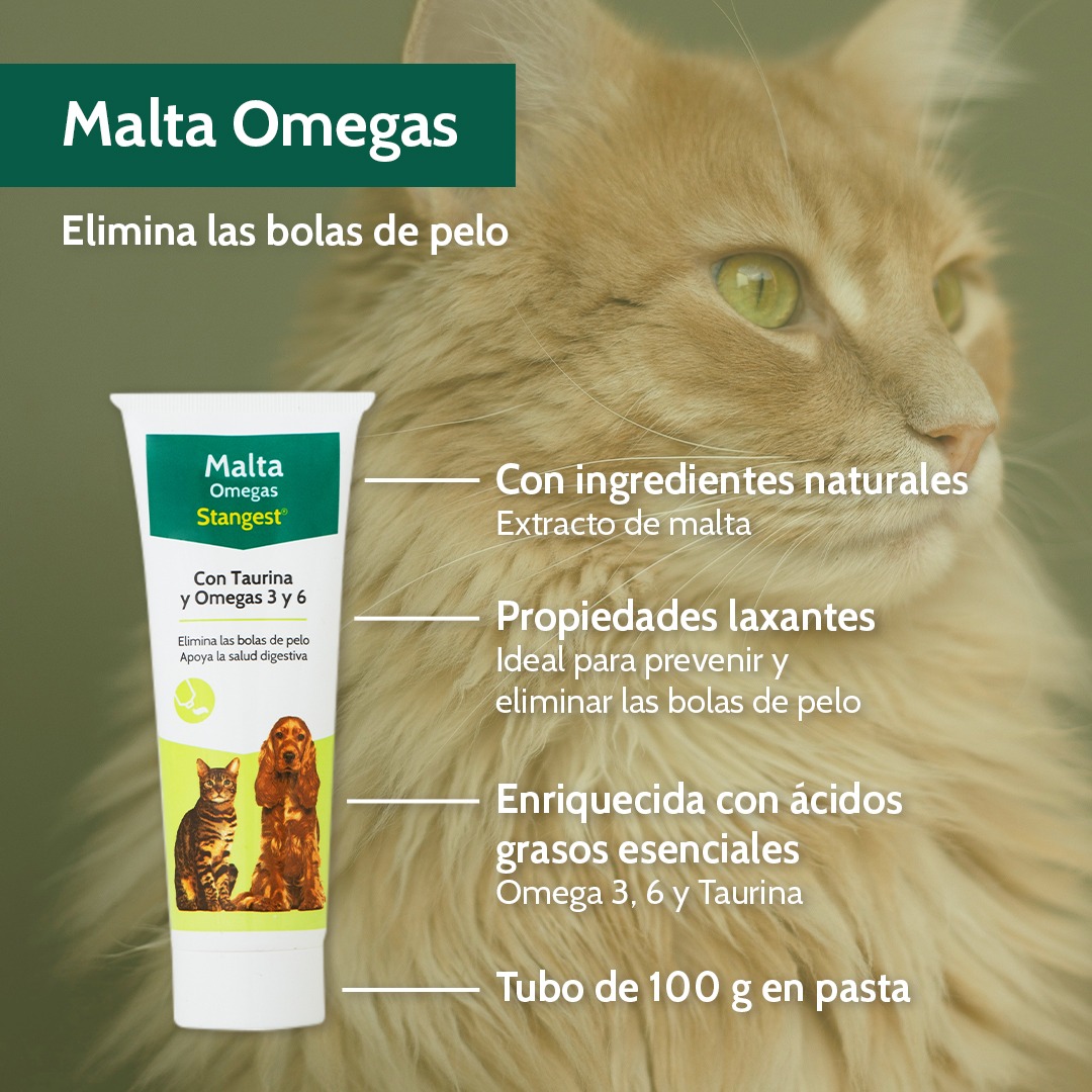 La malta ejerce un ligero efecto laxante que permite regular el tránsito intestinal y facilita la expulsión de las bolas de pelo.