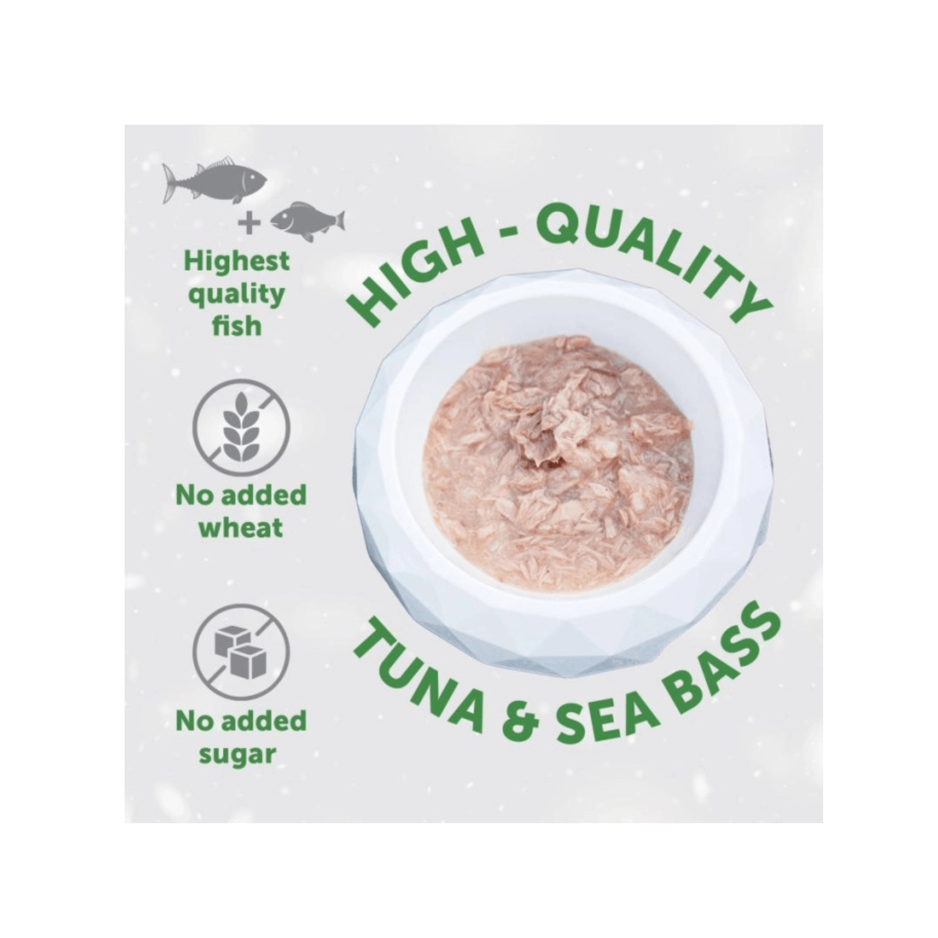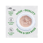 - Con atún y lubina como proteínas principales, proporciona proteínas de alta calidad y ácidos grasos esenciales omega-3, que favorecen la salud del corazón, reducen la inflamación y favorecen un pelaje brillante. La lubina también es rica en vitaminas D y B12, que favorecen la salud ósea y el metabolismo energético.