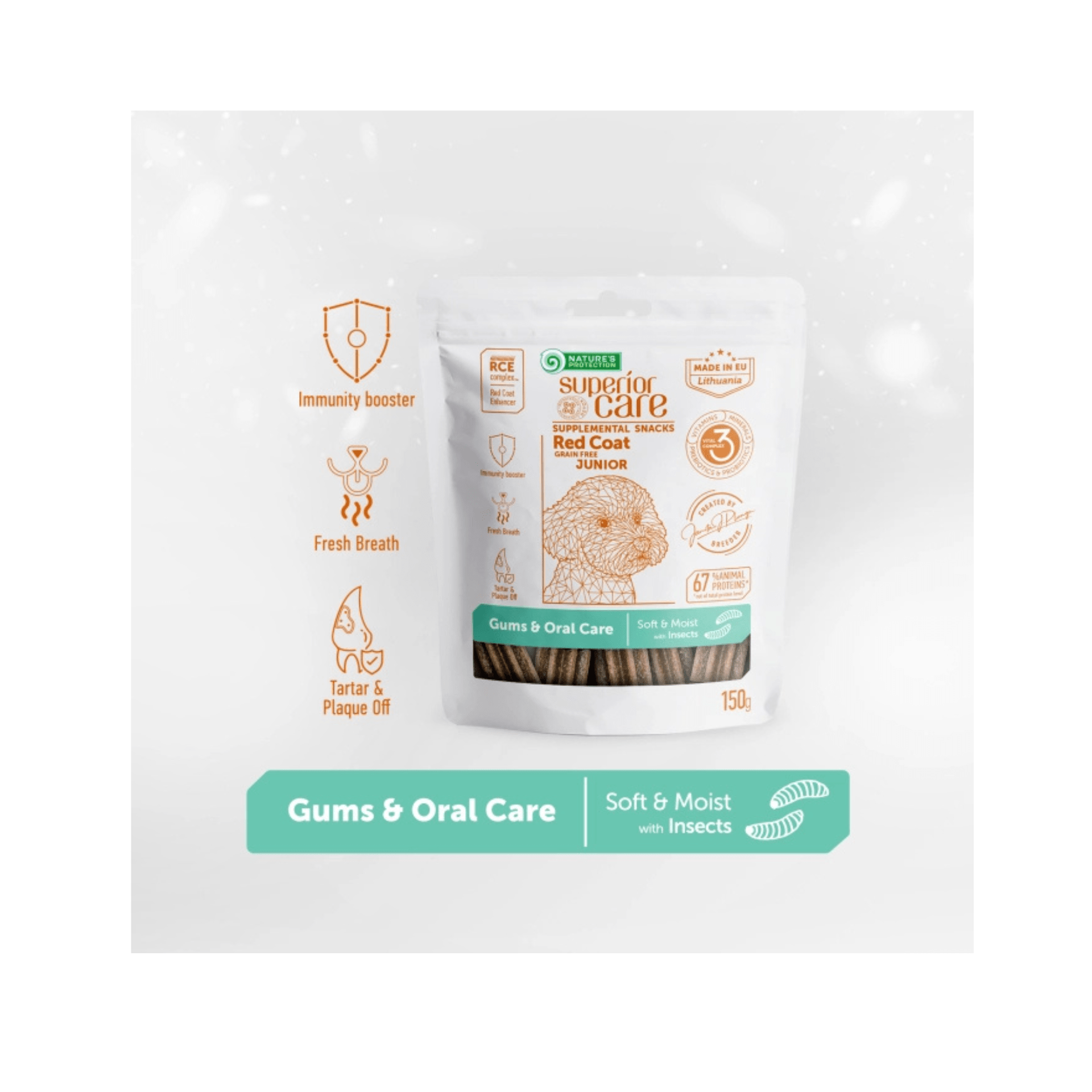 - Nature’s Protection Superior Care Red Coat es un suplemento alimenticio premium a base de insectos especialmente elaborado para mejorar la salud bucal de los perros jóvenes con pelaje rojo, independientemente de la raza.