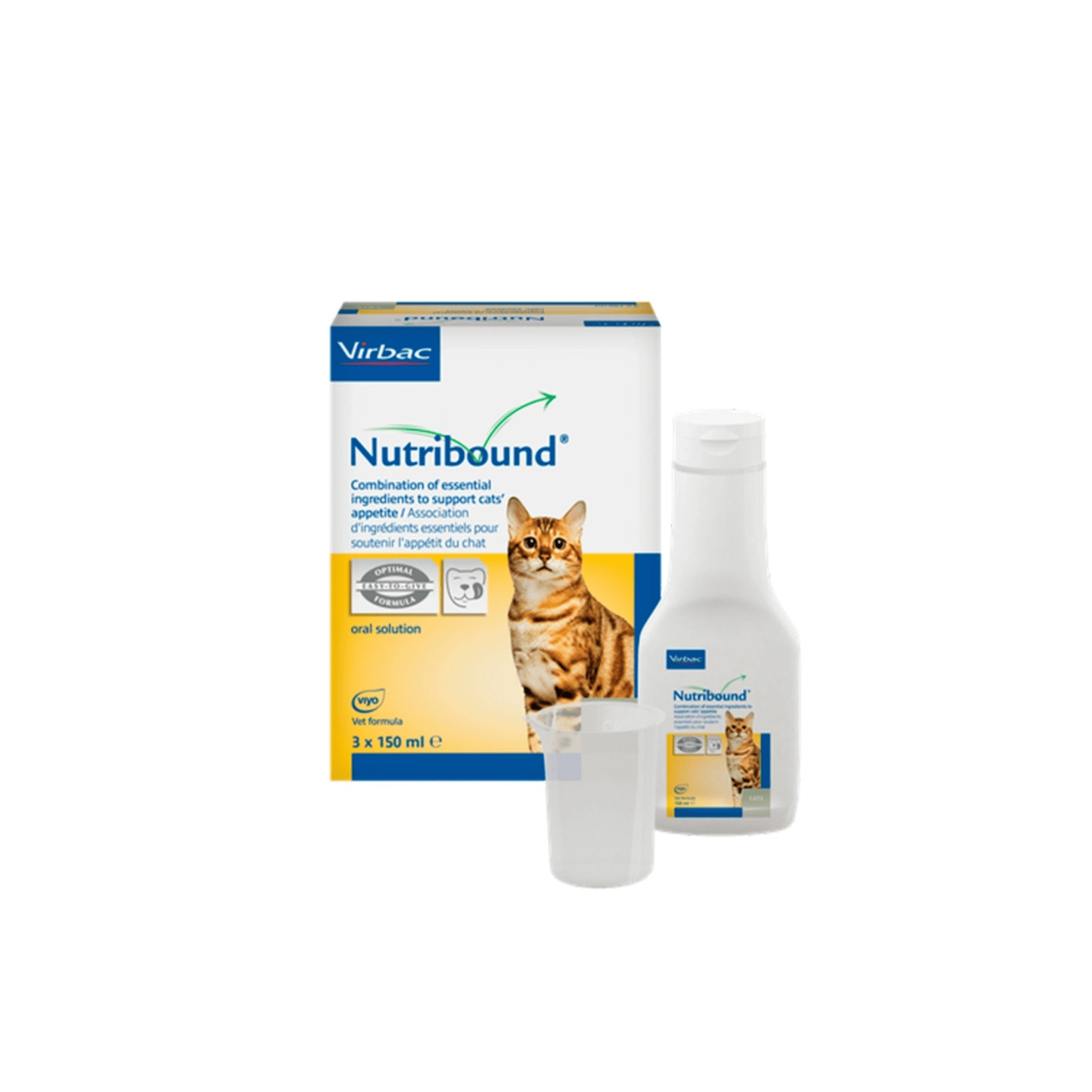 - Nutribound es una fórmula líquida altamente palatable y lista para su uso. La asociación de los ingredientes esenciales estimula al animal a beber y comer hasta el retorno a su dieta habitual: