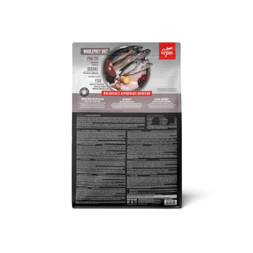 Carne de pollo fresca (14%), huevos enteros frescos (6%), arenque entero fresco (6%), carne de pavo fresca (6%), hígado de pollo fresco (6%), lenguado entero fresco (4%), caballa entera fresca (4%), merluza del pacífico fresca (4%), hígado de pavo fresco (4%), corazón de pollo fresco (4%), pollo (deshidratado, 4%), pavo (deshidratado, 4%), caballa entera (deshidratada, 4%), sardina entera (deshidratada, 4%), arenque entero (deshidratado, 4%), abadejo (deshidratado, 4%), fibra de lentejas, lentejas rojas, lentejas verdes, guisantes verdes, garbanzos, guisantes amarillos, alubias pintas, alubias blancas, cartílago de pollo (deshidratado, 1%), corazón de pavo fresco (1%), fibra de manzana, alga deshidratada (fuente de dha y epa), calabaza (deshidratada), calabaza moscada (deshidratada), zanahorias (deshidratadas), hígado de pollo (liofilizado), hígado de pavo (liofilizado) calabaza fresca, calabaza moscada fresca, calabacín fresco, chirivías frescas, zanahorias frescas, manzanas frescas, peras frescas, col fresca, espinacas frescas, hojas de remolacha fresca, hojas de nabo fresco, alga kelp marrón, arándanos agrios enteros, arándanos enteros, bayas de saskatoon enteras, raíz de achicoria, cúrcuma, cardo mariano, raíz de bardana, lavanda, raíz de malvavisco, rosa mosqueta.