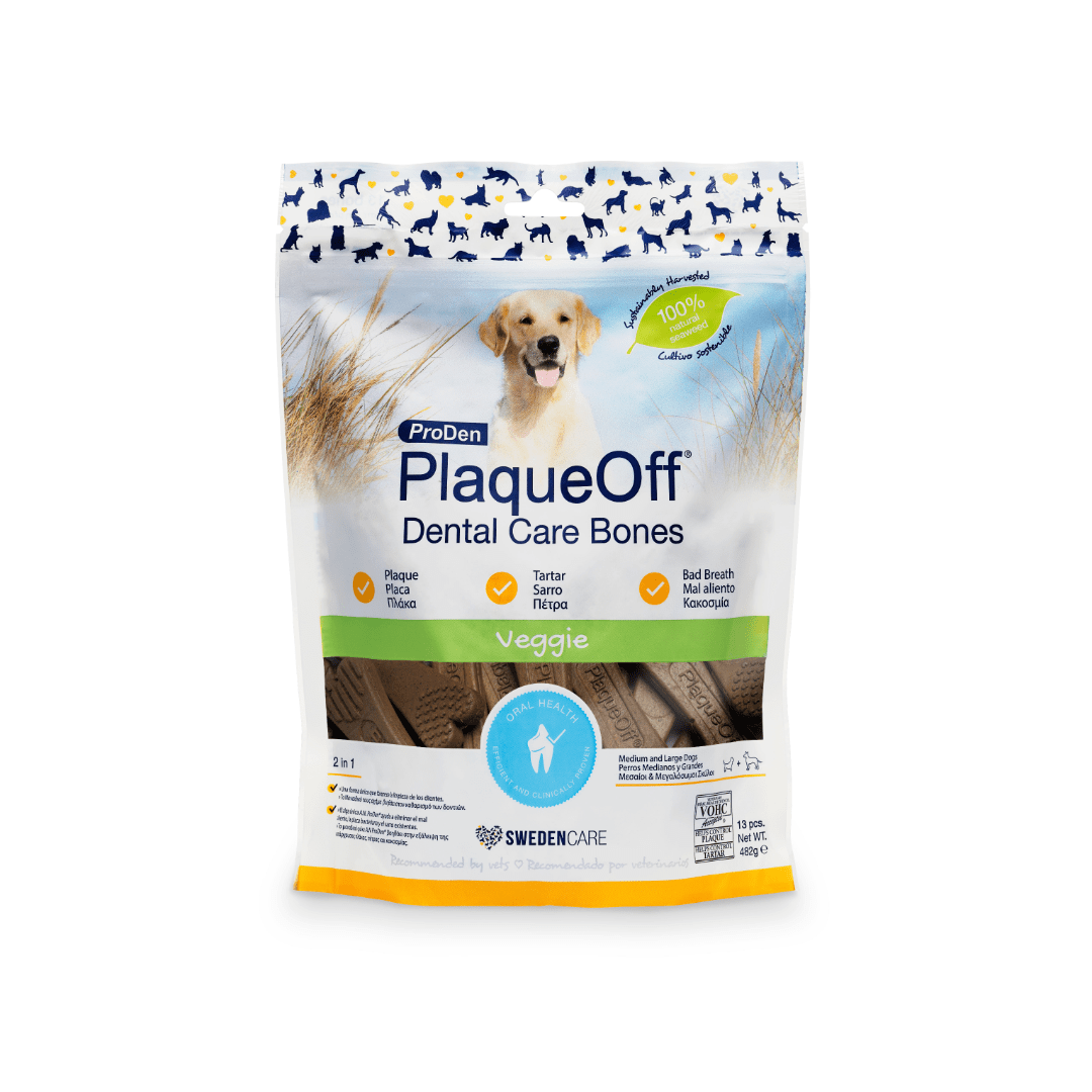 Los huesos dentales son masticables para perros con el probado polvo PlaqueOff® como uno de los ingredientes. Utilizado diariamente, este producto natural hecho con algas puede complementar significativamente la higiene dental ordinaria.