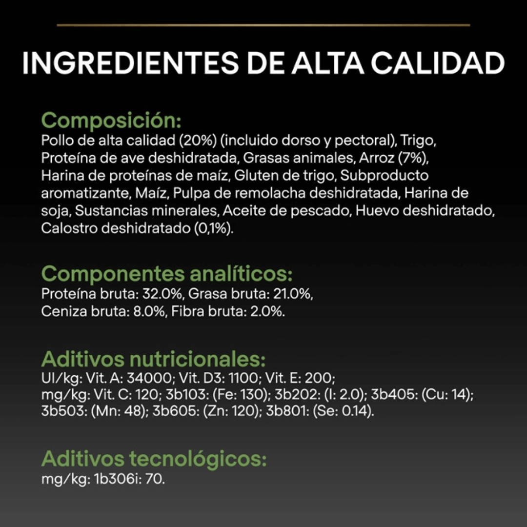 Ingredientes: Pollo (20%), Proteínas de ave deshidratadas, Trigo, Grasa animal, Harina de soja, Arroz (7%), Harina de gluten de maíz, Pulpa de remolacha deshidratada, Maíz, Harina de gluten de trigo, Sustancias minerales, Huevo deshidratado, Aceite de pescado, Subproducto aromatizante y Calostro deshidratado (0,1%).