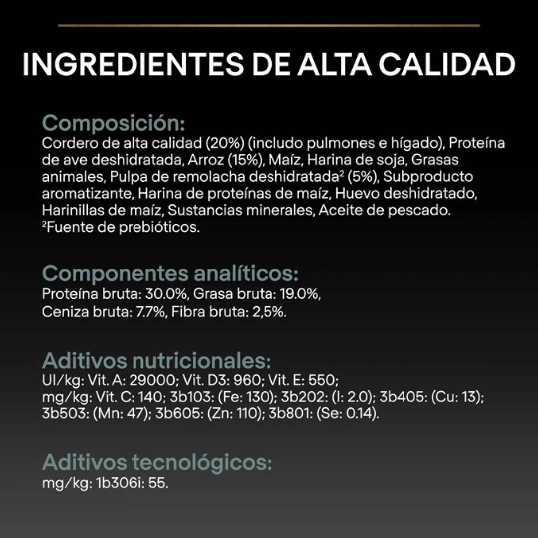 Cordero (16%), trigo, proteínas de ave deshidratadas, grasa animal, gluten, maíz, arroz (7%), harina de soja, subproducto aromatizante, pulpa de remolacha deshidratada, raíz de achicoria deshidratada (1%, fuente de prebióticos), sustancias minerales, huevo deshidratado, aceite de pescado, calostro deshidratado (0.1%).